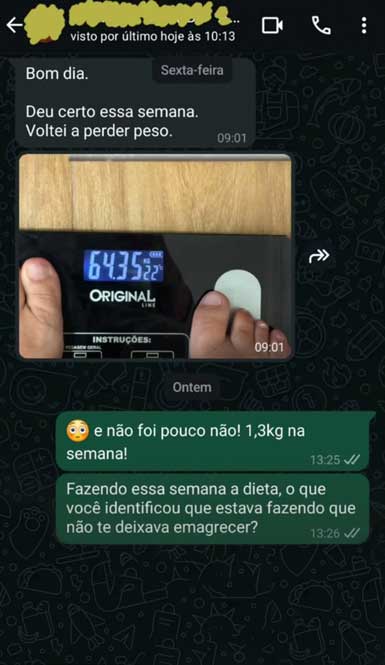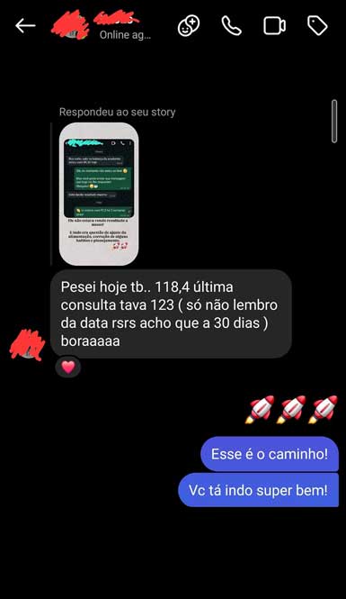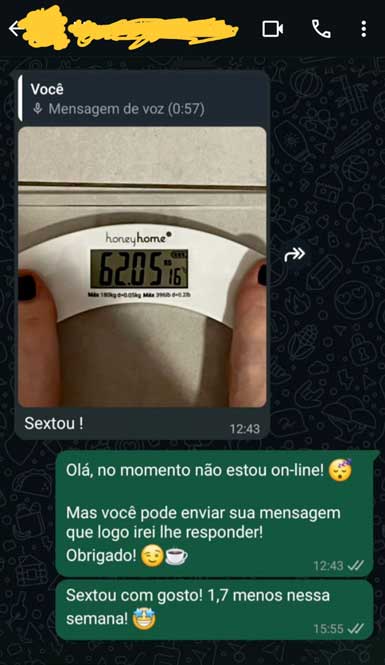 Durante o acompanhamento, você terá canal direto comigo via WhatsApp para dúvidas, ajustes e apoio motivacional.